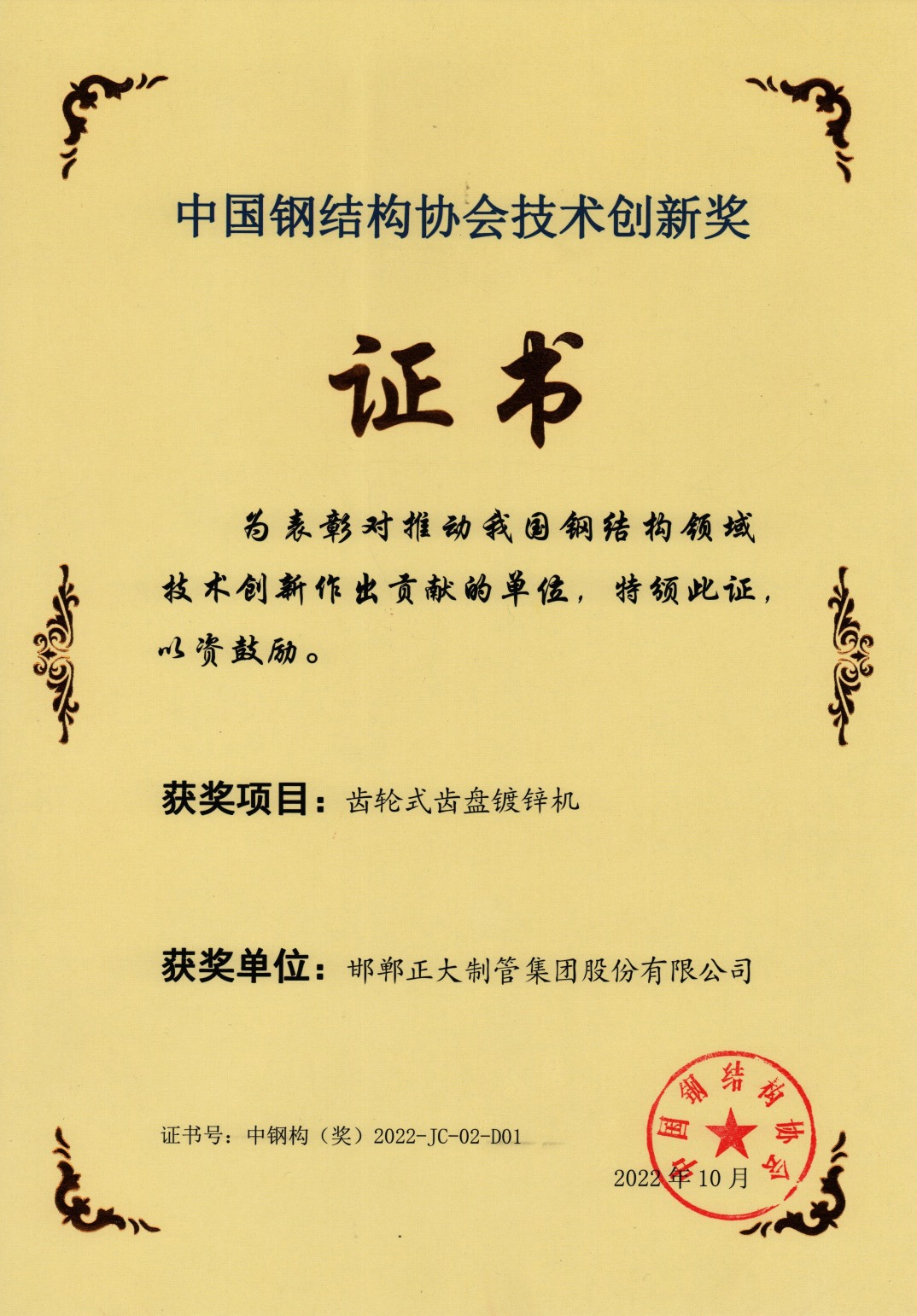 近日,中國(guó)鋼結(jié)構(gòu)大會(huì)暨粵港澳大灣區(qū)鋼結(jié)構(gòu)發(fā)展峰會(huì)在廣州召開,會(huì)上對(duì)獲得中國(guó)鋼結(jié)構(gòu)協(xié)會(huì)2022年度科學(xué)技術(shù)獎(jiǎng)的單位頒獎(jiǎng),正大制管申報(bào)的《齒輪式齒盤鍍鋅機(jī)》項(xiàng)目獲得中國(guó)鋼結(jié)構(gòu)協(xié)會(huì)“技術(shù)創(chuàng)新獎(jiǎng)”。